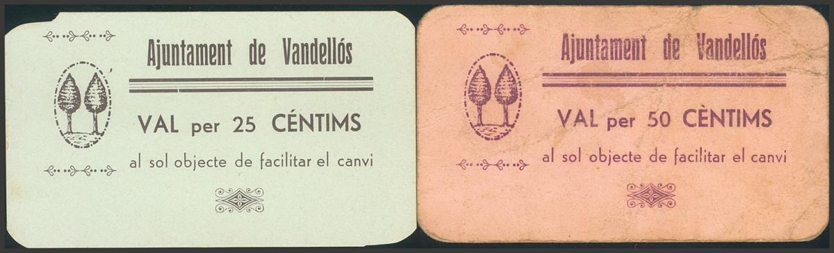 VANDELLOS (TARRAGONA). 25 Céntimos y 50 Céntimos. (1937ca). (González: 10590, 10592). Raros. MBC+/EBC.