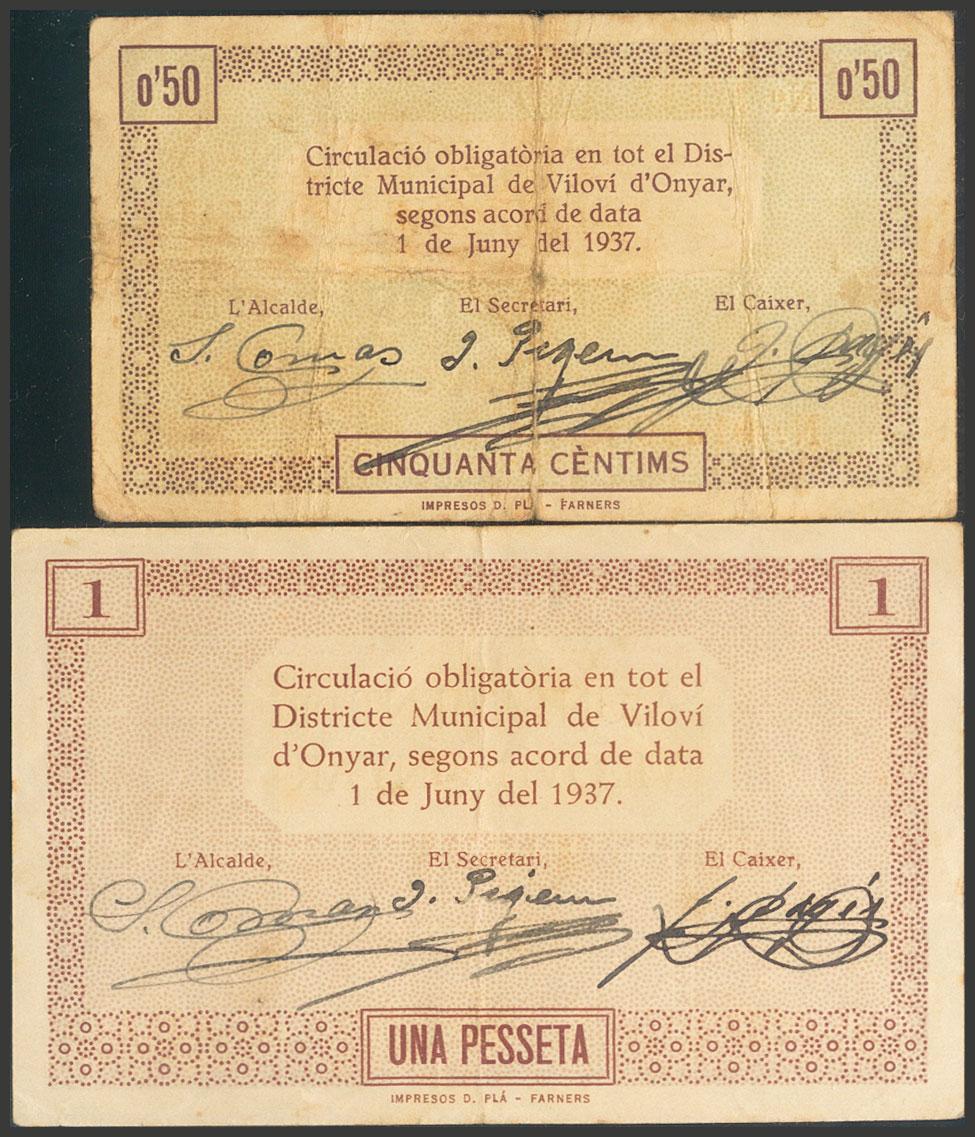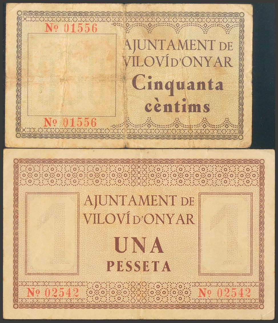 VILOVI DE ONYAR (GERONA). 50 Céntimos y 1 Peseta. 1 de Julio de 1937. (González: 10903/04). Rara serie completa. MBC+.