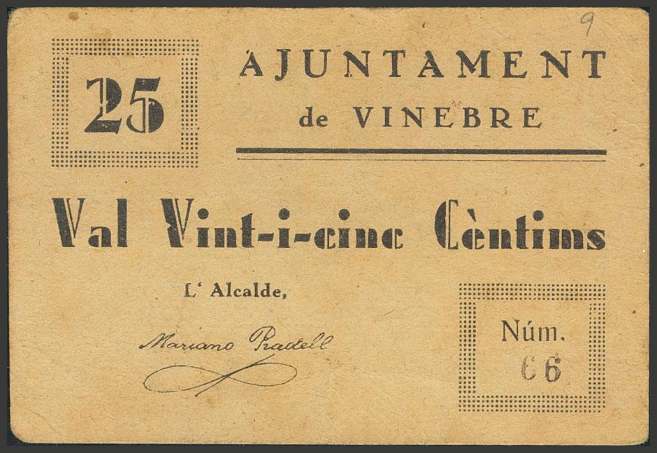 VINEBRE (TARRAGONA). 25 Céntimos. (1937ca). (González: 10917). Raro. EBC.