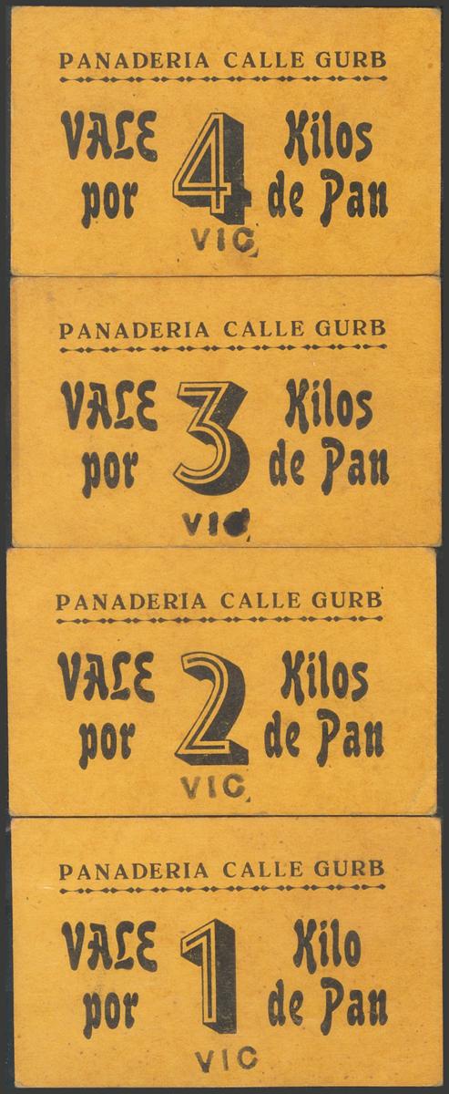 (1937ca). Conjunto de 4 vales de la Panadería Calle Gurb de 1 Kilo, 2 Kilos, 3 Kilos y 4 Kilos de pan. EBC-.
