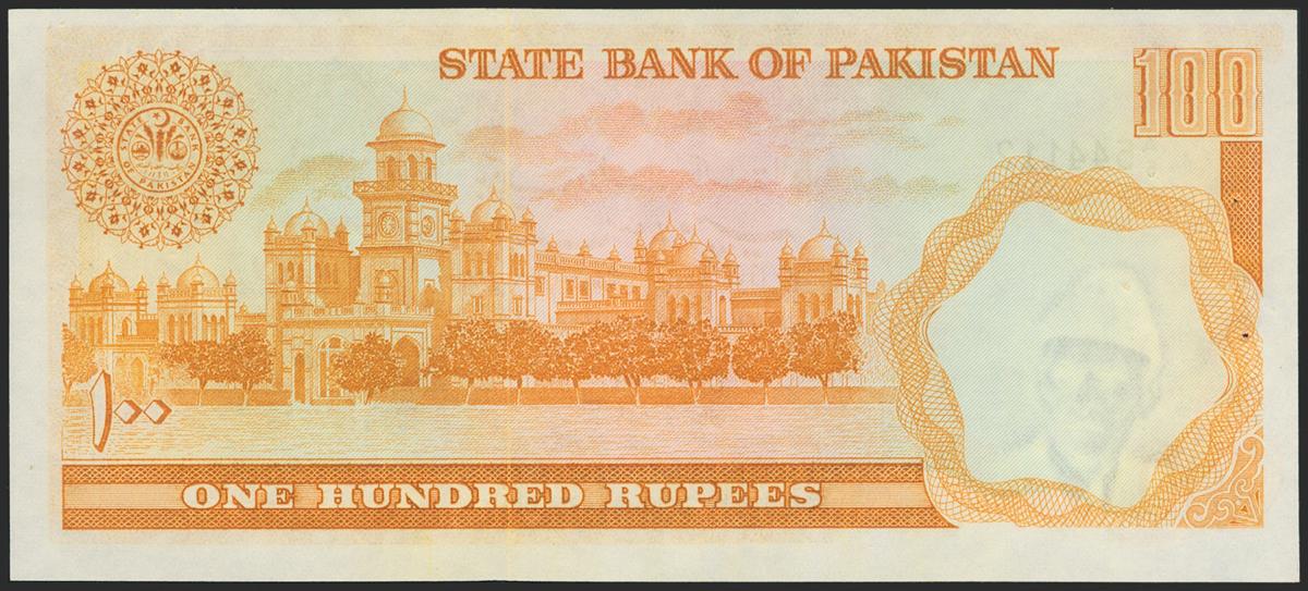 PAKISTAN. 100 Rupees. 1975-1978. Stamped "For Haj pilgrims from Pakistan / For use in Saudi Arabia only". (Pick: R7). Usual staple holes. Uncirculated.