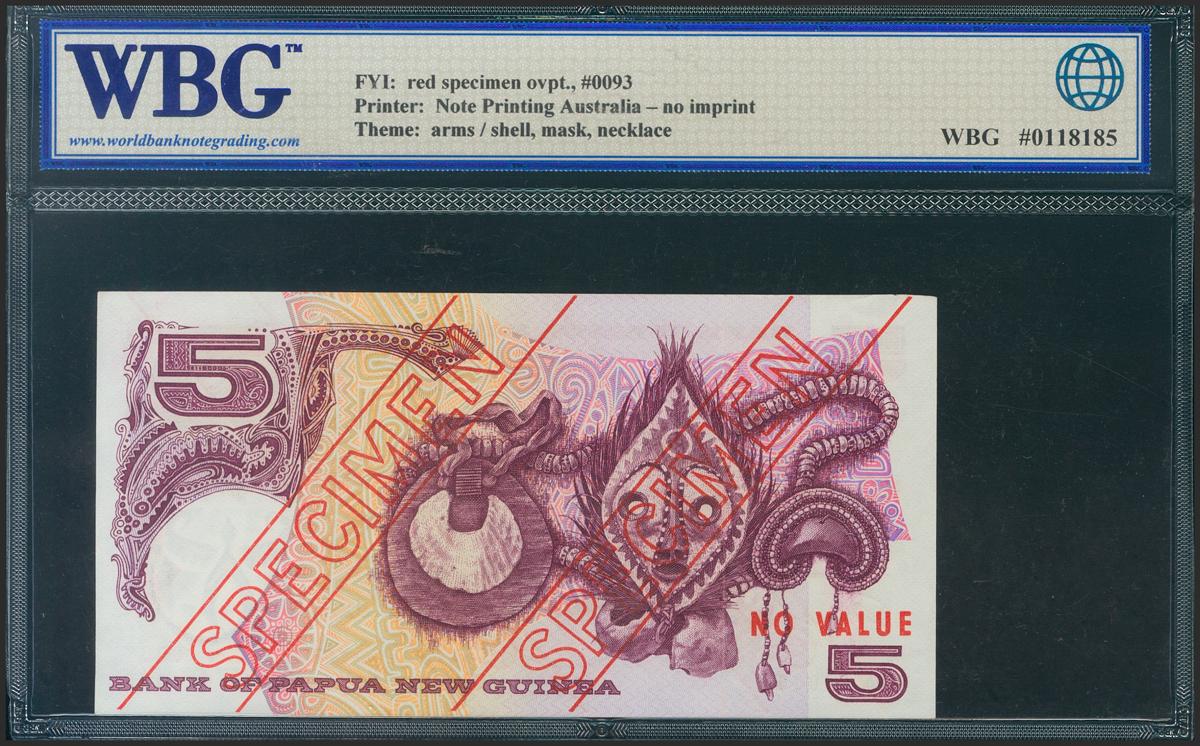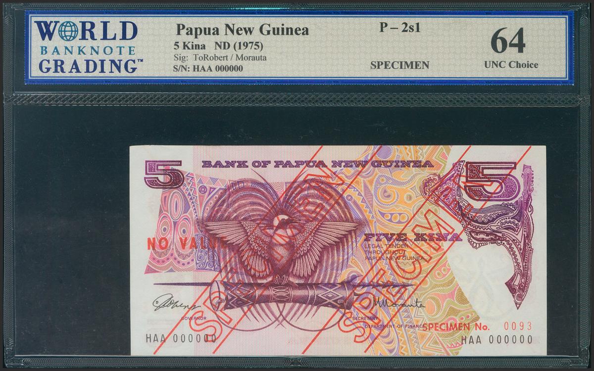 PAPUA NEW GUINEA. 5 Kina. 1975. Signatures: ToRobert & Morauta. Specimen. (Pick: 2s1). Rare. WBG64.