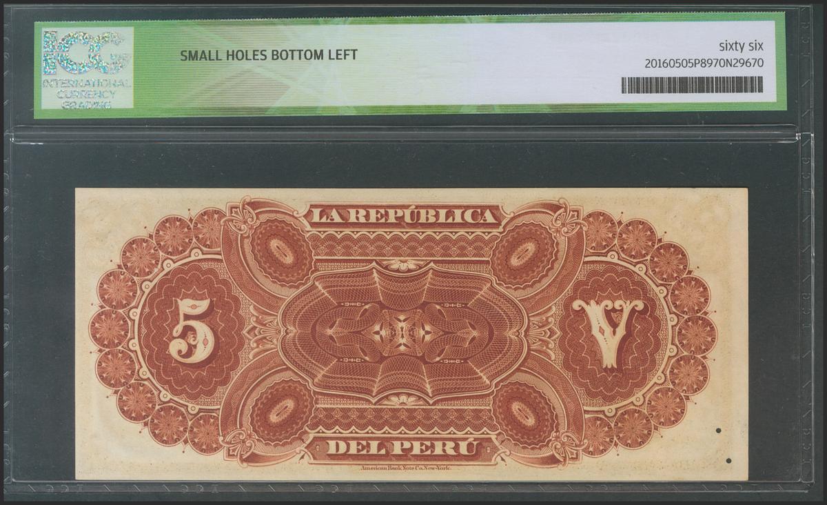 PERU. 5 Pesos. 30 June 1879. Serie A. (Pick: 3). ICG66*(Small holes bottom left).
