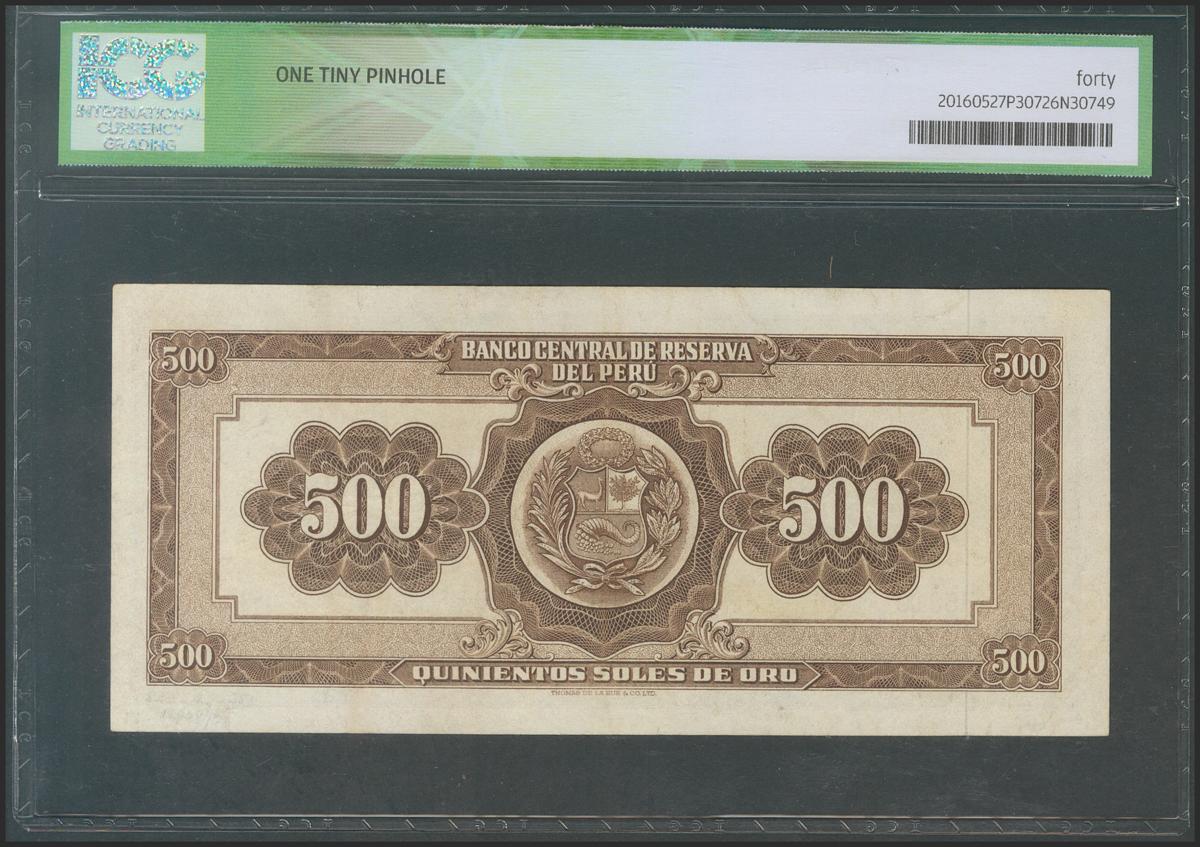 PERU. 500 Soles. 10 December 1959. Serie L3. (Pick: 80b). ICG40*(One tiny Pinhole).