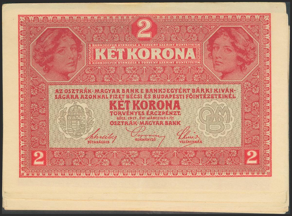 AUSTRIA. Set of 10 banknotes: 1 Korona, 2 Korona. 1917 (1919). (Pick: 49, 50). 49 is Extremely Fine. Out of the 50 only 1 in Extremely Fine, the rest mainly with soft corners. Extremely Fine to About Uncirculated.