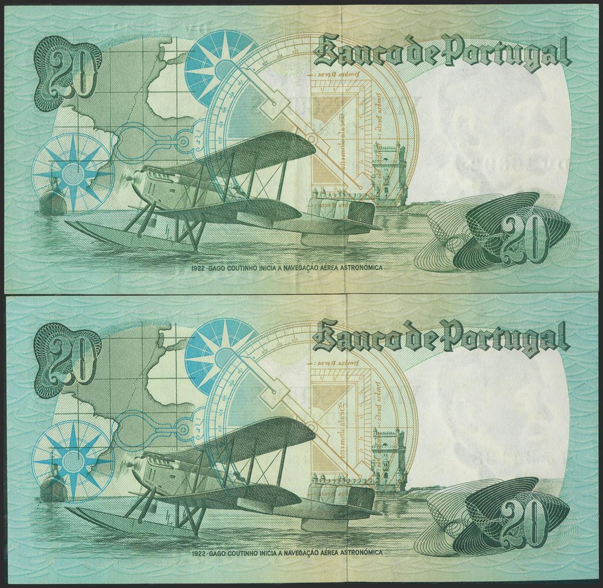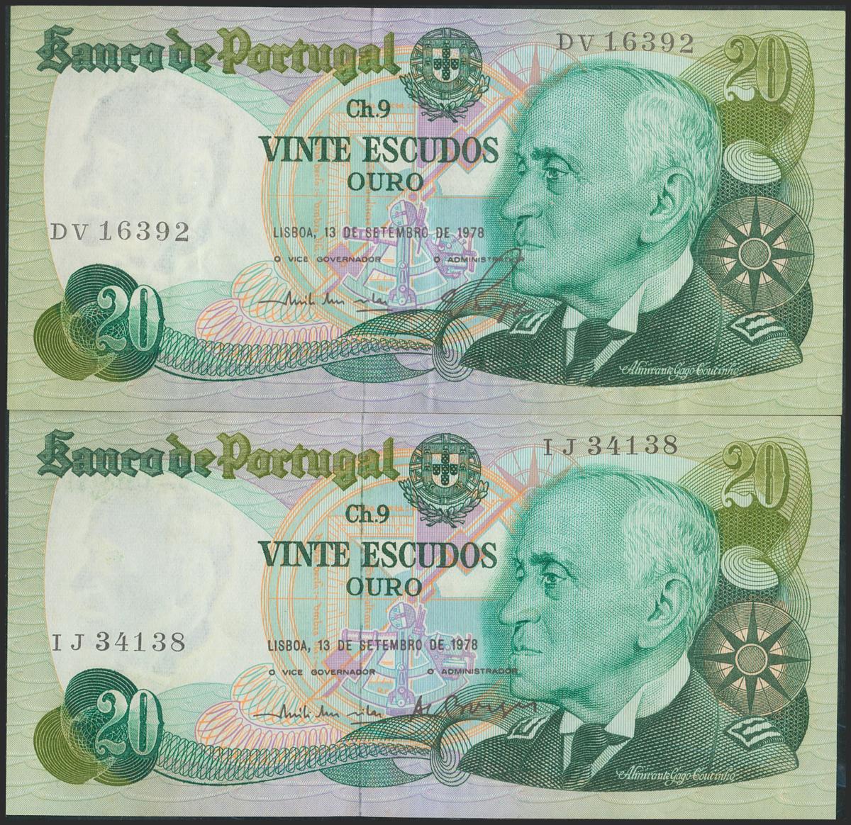 PORTUGAL. Set of 2 banknotes of 20 Escudos from 1978. Banco de Portugal. Chapa 9. Two letters preffix. All different signatures. (Pick: 176a). Extremely Fine to About Uncirculated.