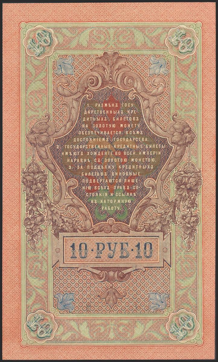 RUSSIA. 10 Rubles. 1909 (1912). Soviet Government. Signatures: Shipov and Feduleev. (Pick: 11c). Minimal mishandling on upper left corner. About Uncirculated.