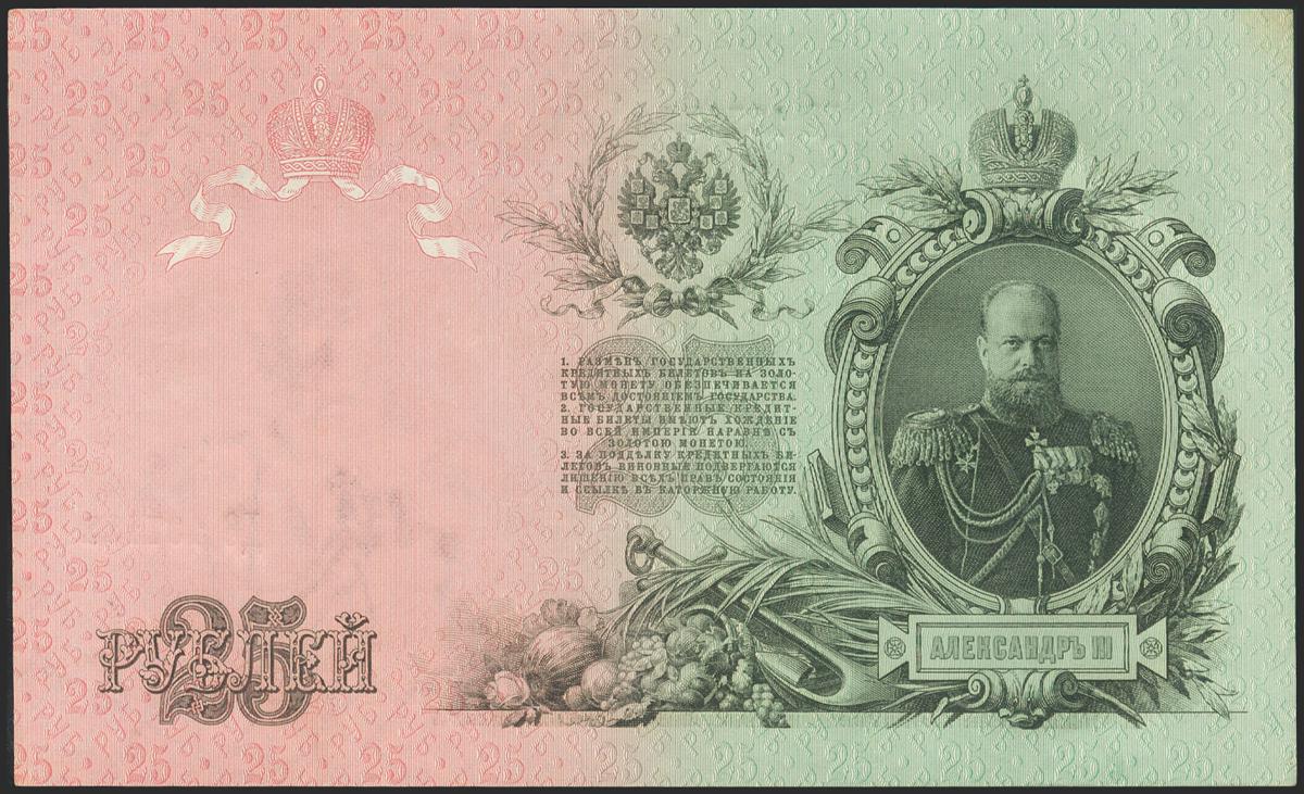 RUSSIA. 25 Rubles. 1909 (1912). Provisional Government. Signatures: Shipov and Gusiev. (Pick: 12b). Imperfect corners, large banknote. About Uncirculated.