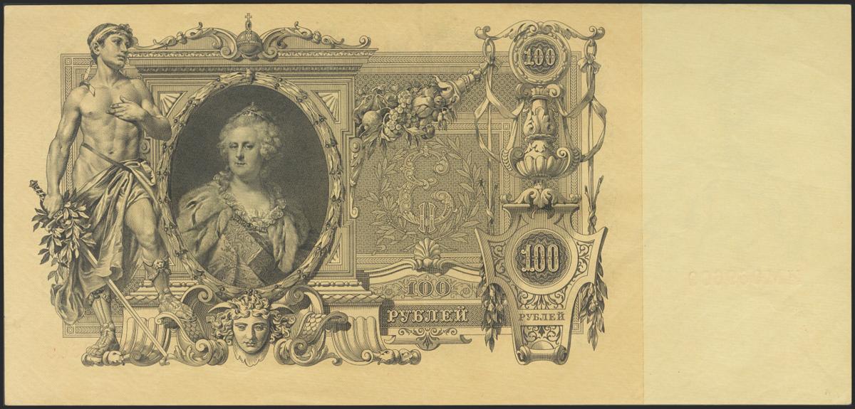RUSSIA. 100 Rubles. 1910 (1912). Signatures: Shipov and Metz. (Pick: 13b). Very large note, very crispy paper and two small tears on right edge. Extremely Fine.