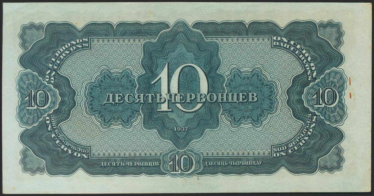 RUSSIA. 10 Chervontsev. 1937. USSR State Bank. (Pick: 137). Minor mishandling and one rust mark from a staple on the back, large banknote. About Uncirculated.