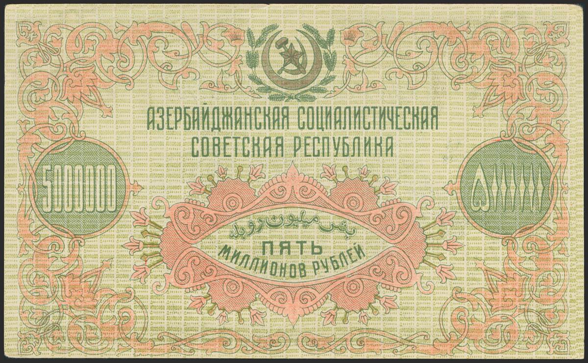 RUSSIA (TRANSCAUCASIA). 5000000 Rubles. 1923. Azerbaijan Socialist Soviet Republic. (Pick: S720). Rare, very small tear on right edge, some mishandling on margins. About Uncirculated.