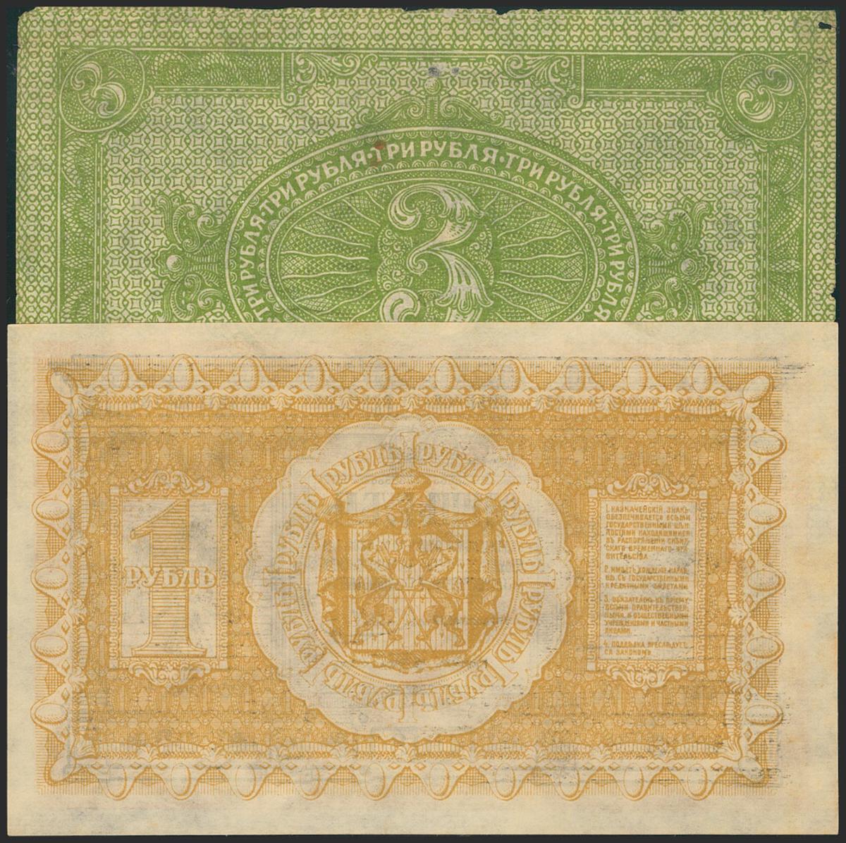 RUSSIA. Set of 2 banknotes: 1 Ruble, 3 Ruble. 1918-1919. Siberia and Urals. (Pick: S816, S827). About Fine to About Uncirculated.