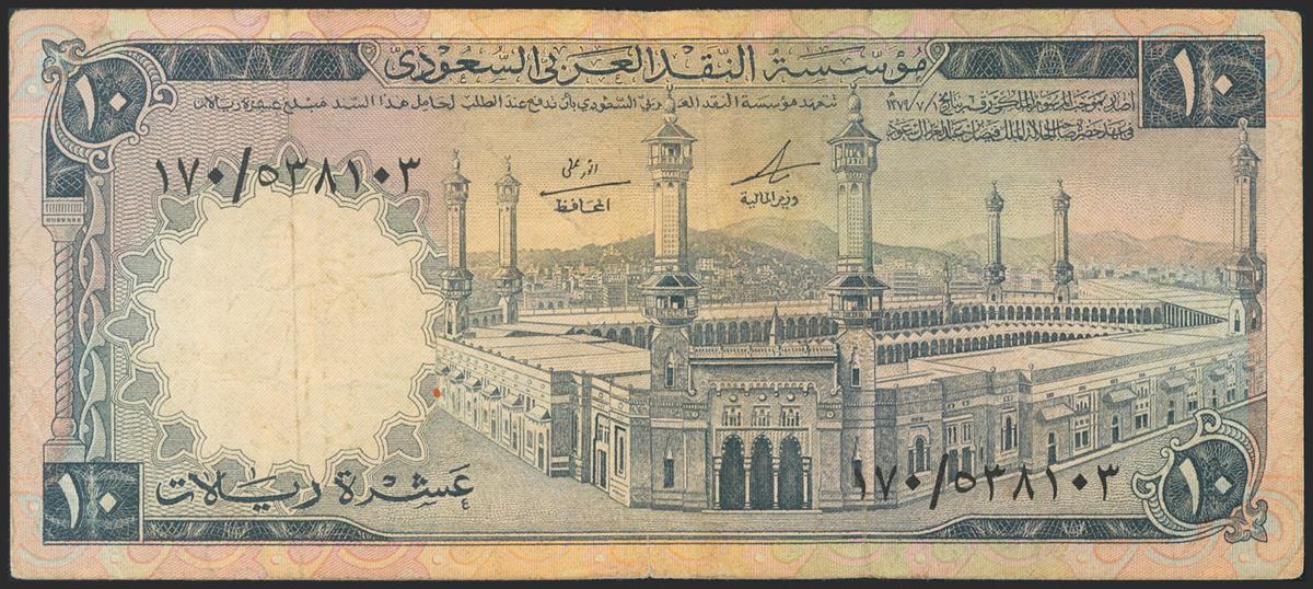 SAUDI ARABIA. 1 Riyal. 1956. (Pick: 2). Cut on upper left section, partially restored with adhesive, but good presence in general. Very Good.