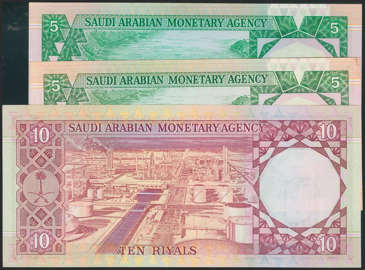 SAUDI ARABIA. Set of 3 banknotes: 5 Riyals (2), 10 Riyals. 1977. (Pick: 17a, 17b, 18). Uncirculated.