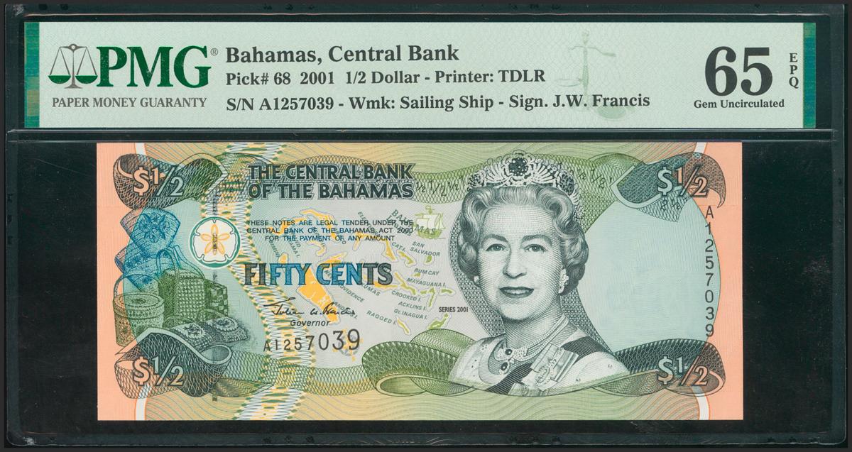 BAHAMAS. 1/2 Dollar. 2001. (Pick: 68). PMG65EPQ.