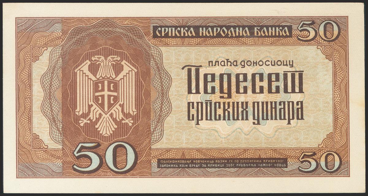 SERBIA. 50 Dinara. 1942. (Pick: 29). Slight oxidation on left margin. About Uncirculated.