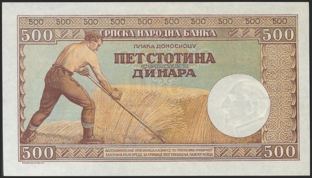 SERBIA. 500 Dinara. 1942. (Pick: 31). Minimal mishandling marks with imperfect corners. About Uncirculated.