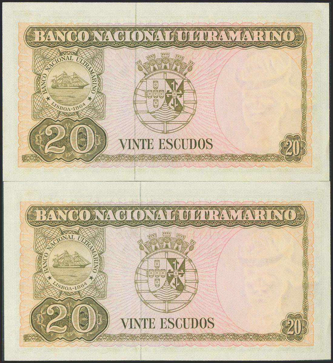 TIMOR. 20 Escudos. 1967. Banco Nacional Ultramarino. Correlative pair. (Pick: 26a). Uncirculated.