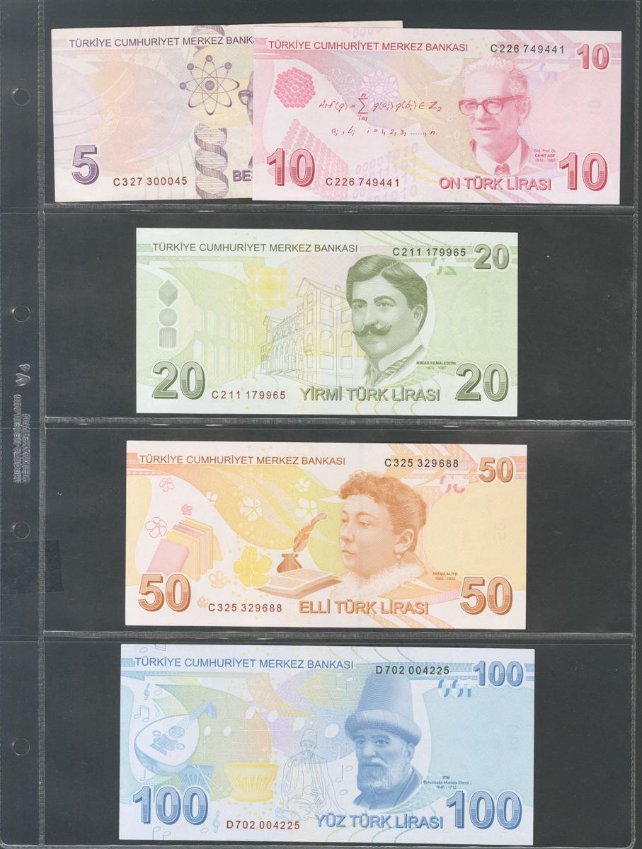 TURKEY. Set of 5 banknotes: 5 Lira, 10 Lira, 20 Lira, 50 Lira, 100 Lira. 2017. (Pick: 222c, 223c, 224b, 225c, 226c). Interesting set. All Uncirculated except for 222c which is Very Fine.