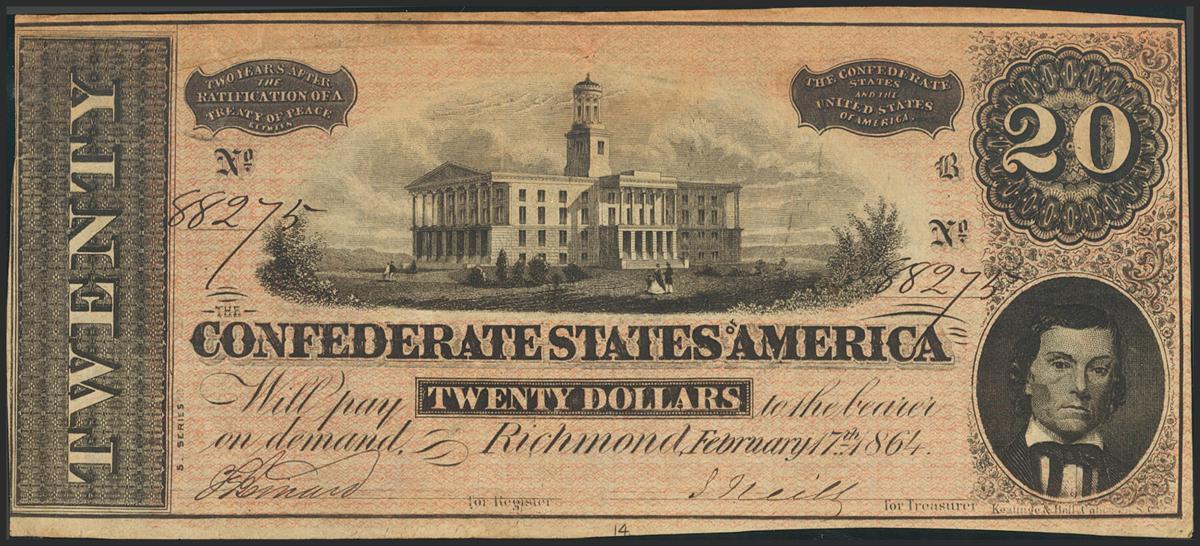 UNITED STATES. CONFEDERATE STATES OF AMERICA. 20 Dollars. 1864. (Pick: 69) (Friedberg: CS-67). Pinholes. Very Fine.