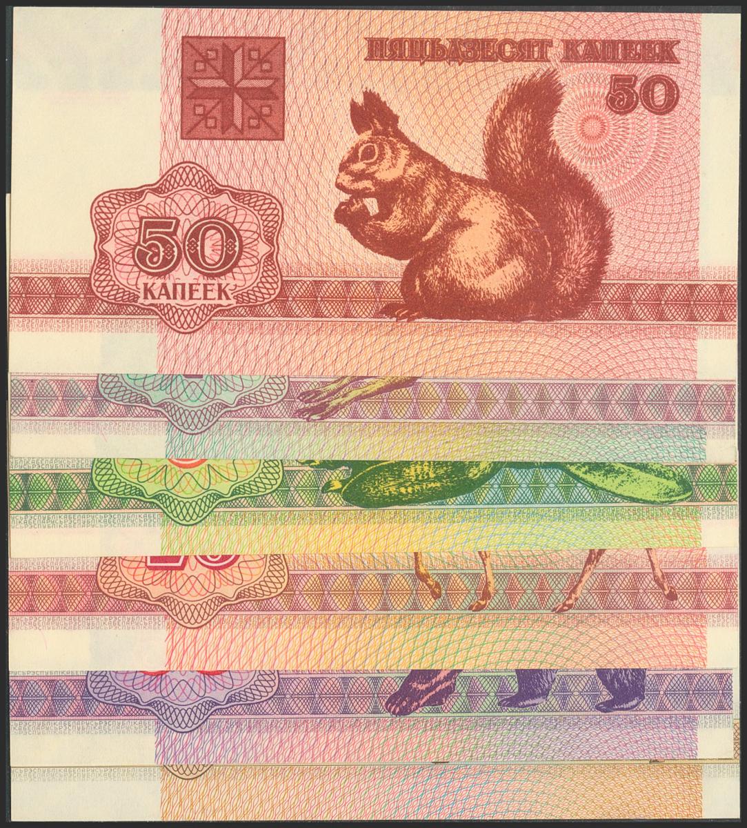 BELARUS. Set of 6 banknotes: 50 Kopeek, 1 Ruble, 3 Rubles, 25 Rubles, 50 Rubles and 100 Rubles. 1992. (Pick: 1, 2, 3, 6, 7, 8). Uncirculated.