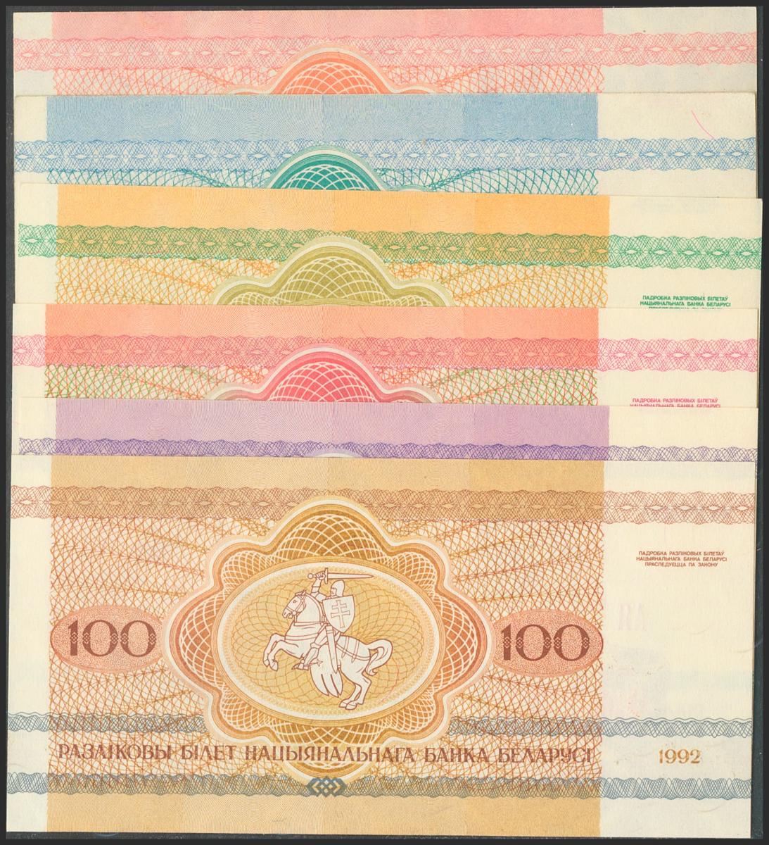 BELARUS. Set of 6 banknotes: 50 Kopeek, 1 Ruble, 3 Rubles, 25 Rubles, 50 Rubles and 100 Rubles. 1992. (Pick: 1, 2, 3, 6, 7, 8). Uncirculated.