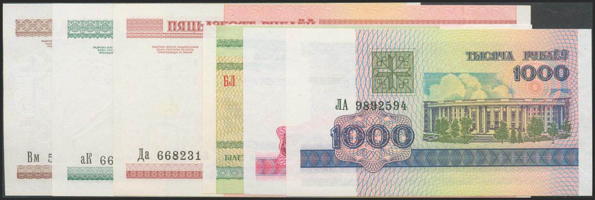 BELARUS. Set of 8 banknotes: 1 Ruble, 5 Rubles, 10 Rubles, 20 Rubles, 50 Rubles, 100 Rubles, 1000 Rubles and 5000 Rubles. 1998, 2000. (Pick: 16, 17, 21, 22, 23, 24, 25a, 26a). Uncirculated.