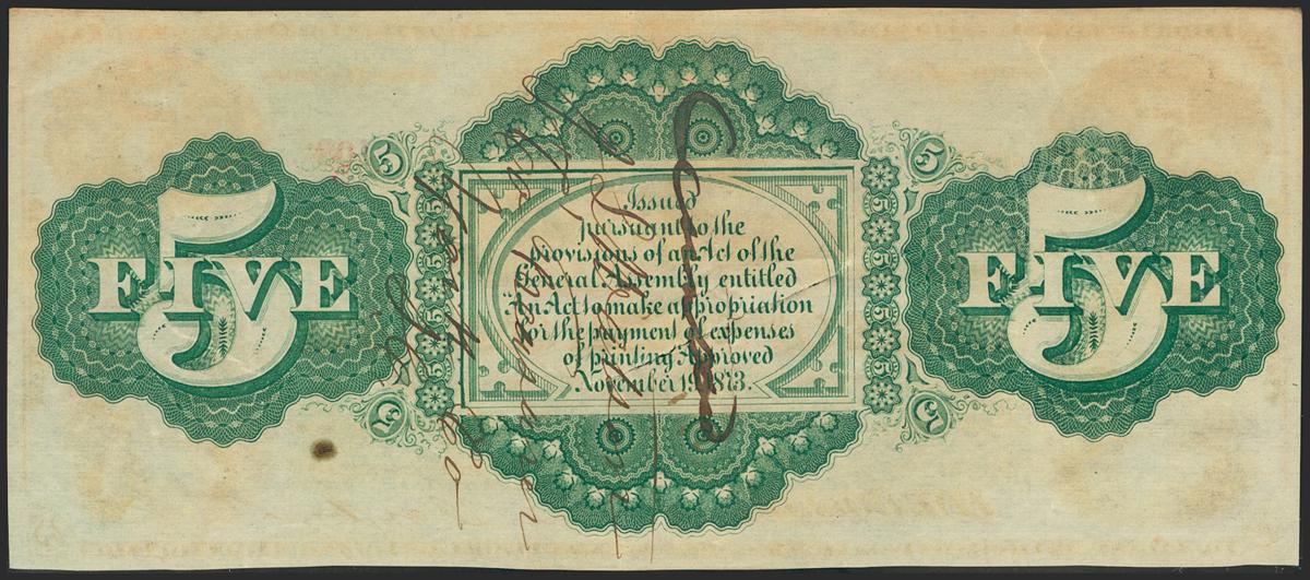 UNITED STATES OF AMERICA. Obsolete Currency. 5 Dollars. 1873. State of South Carolina. (Pick: Not Listed). Cross-cut cancelled, plus one pinhole. About Uncirculated.