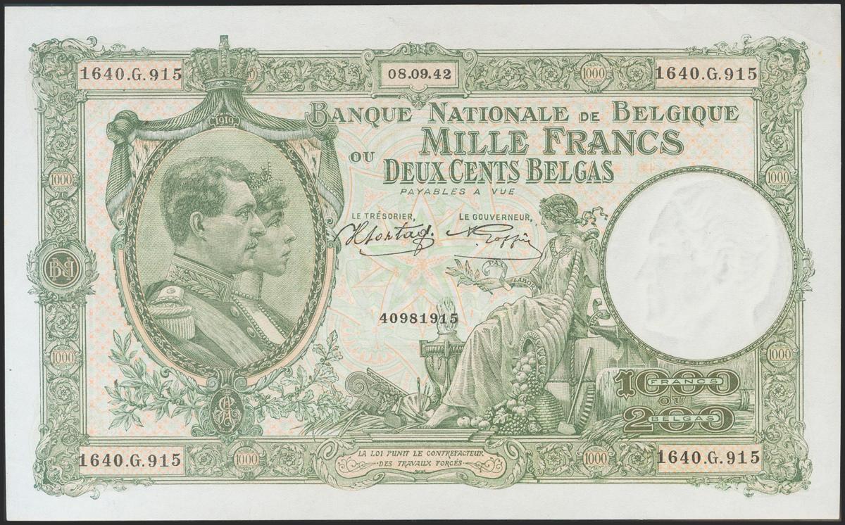 BELGIUM. 1000 Francs / 200 Belgas. 1942. (Pick: 110). Small mishandling issues and one pinhole, very large and attractive note. About Uncirculated.