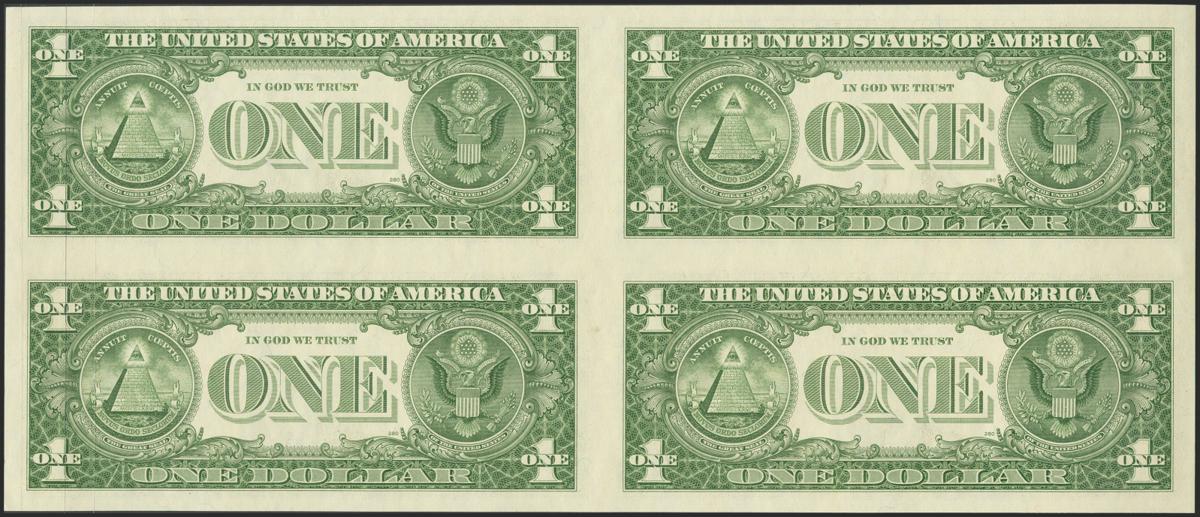 UNITED STATES OF AMERICA. Uncut sheet of four 1 Dollar bills. 1988. Type 480aI (Minneapolis, MN). Rare. Uncirculated.