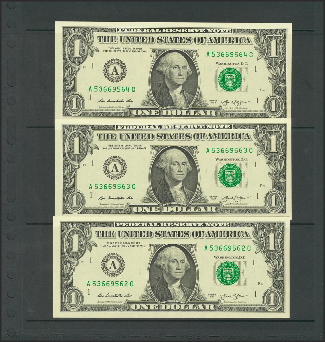 UNITED STATES OF AMERICA. Set of 3 banknotes of 1 Dollar. 2013. Correlative run. Federal Reserve Note. Boston. (Pick: 537, Friedberg: 3001-G). Extremely Fine.