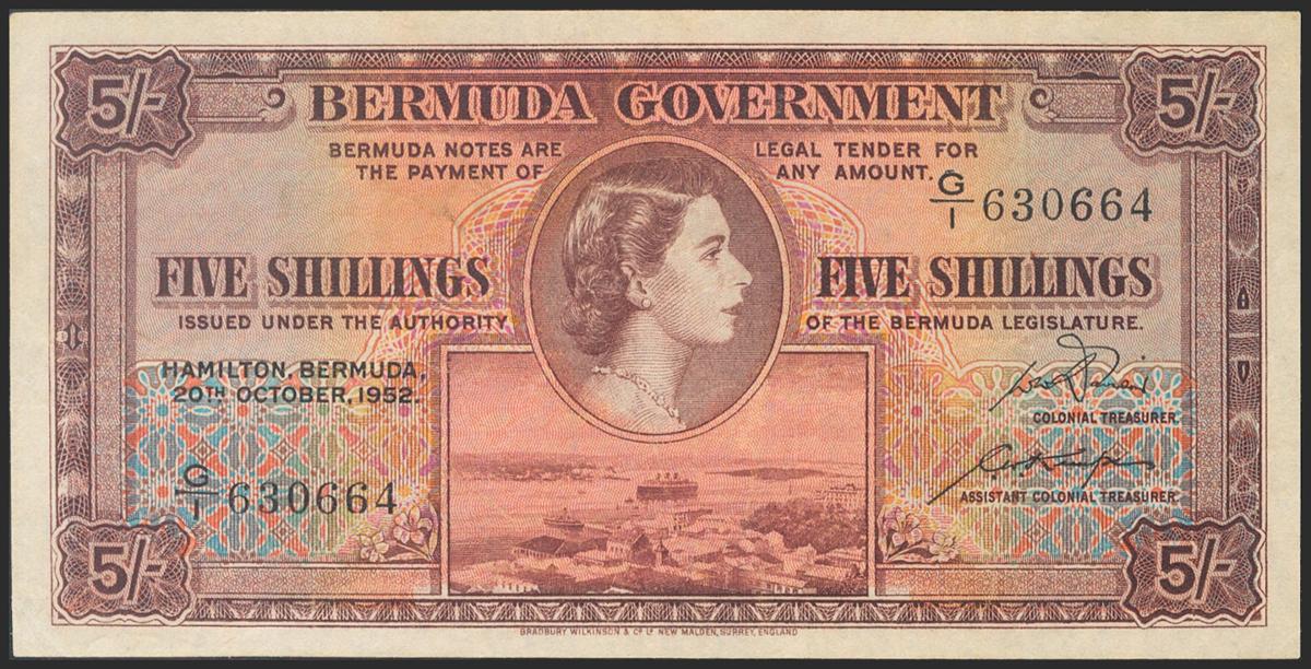 BERMUDA. 5 Shillings. 1952. (Pick: 18a). Pressed. Very Fine.