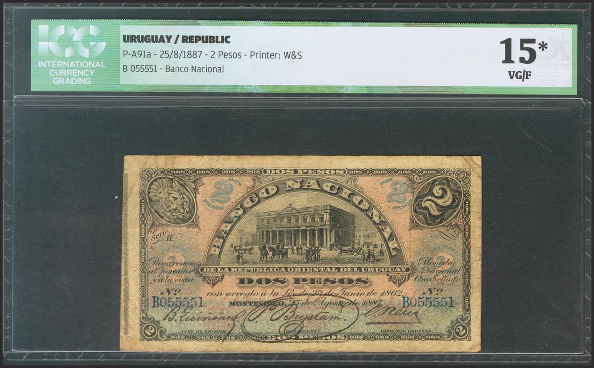 URUGUAY. 2 Pesos. 25 August 1887. Serie H. (Pick: A91a). ICG15*(Pinholes).