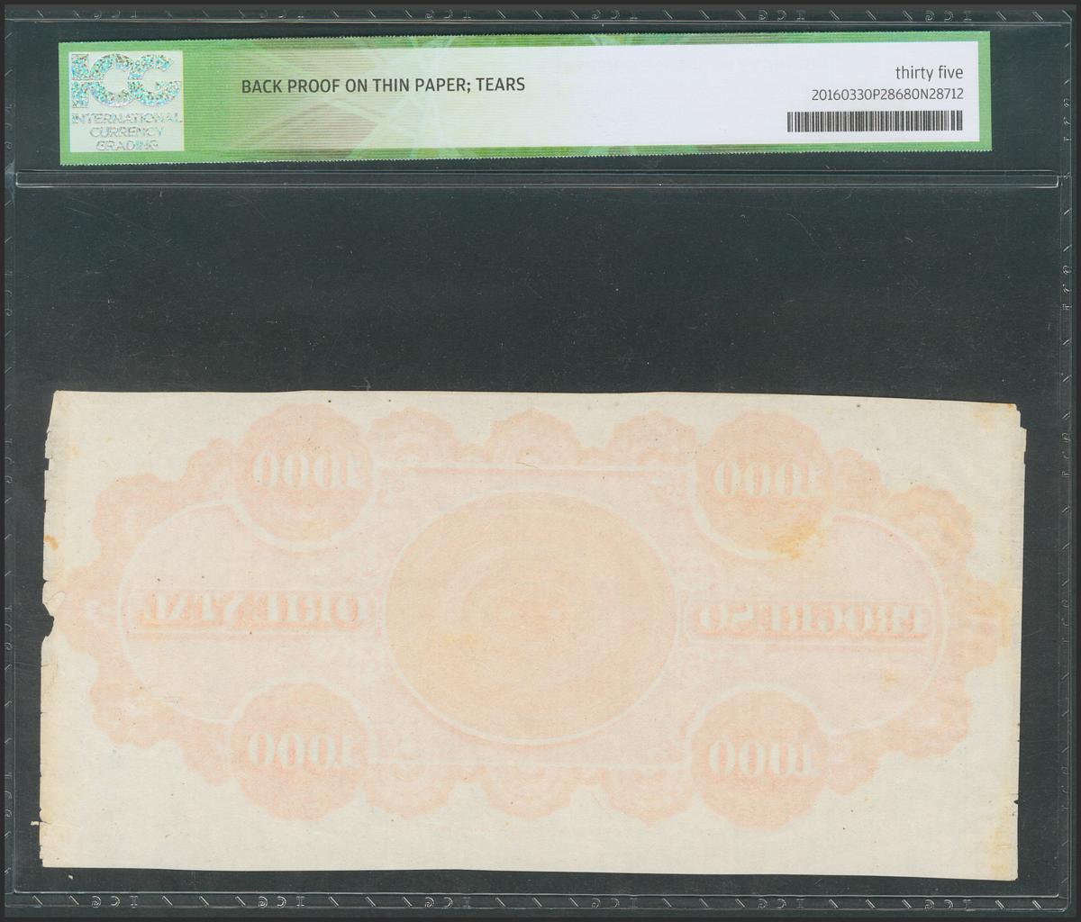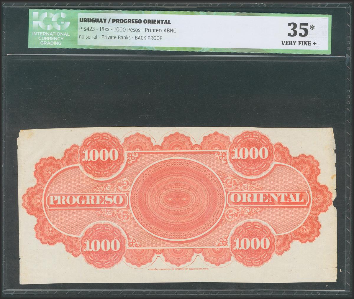URUGUAY. 1000 Pesos. (1968ca). Back proof. (Pick: S423). ICG35*(Back proof om thin paper).