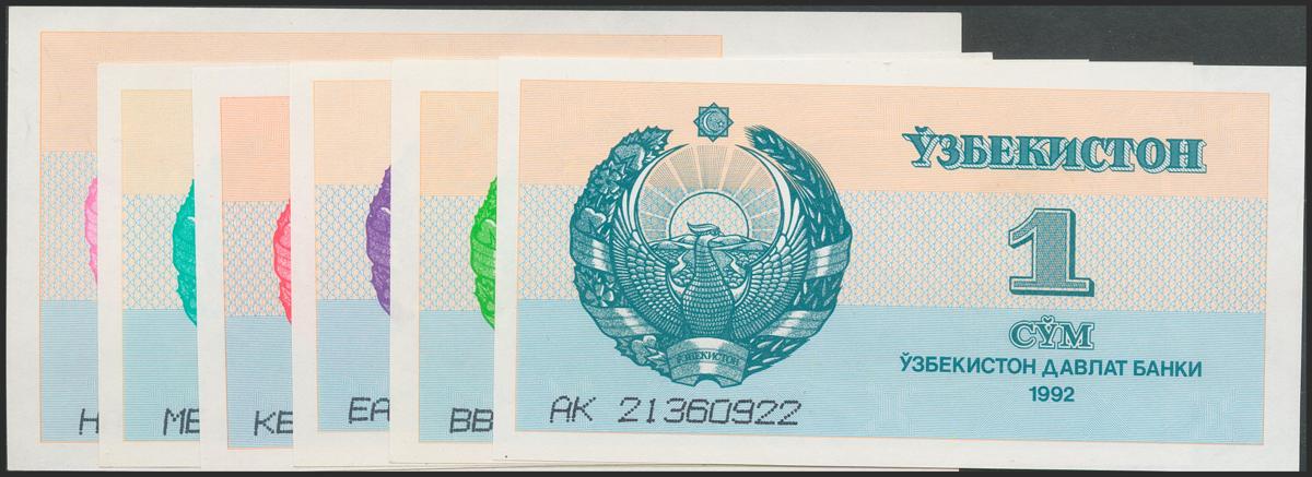 UZBEKISTAN. Set of 6 banknotes: 1 Som, 3 Som, 5 Som, 10 Som, 25 Som and 50 Som. 1992. (Pick: 61, 62, 63, 64, 65, 66). Uncirculated.