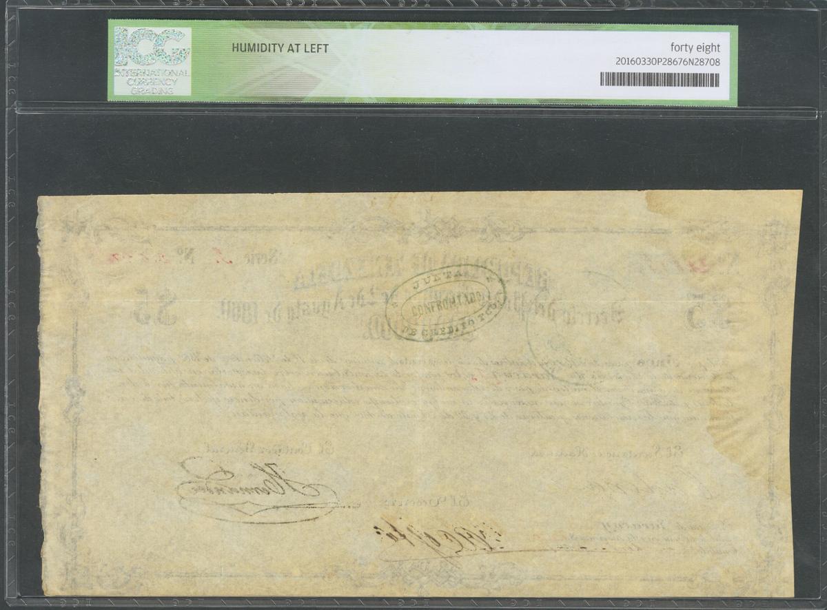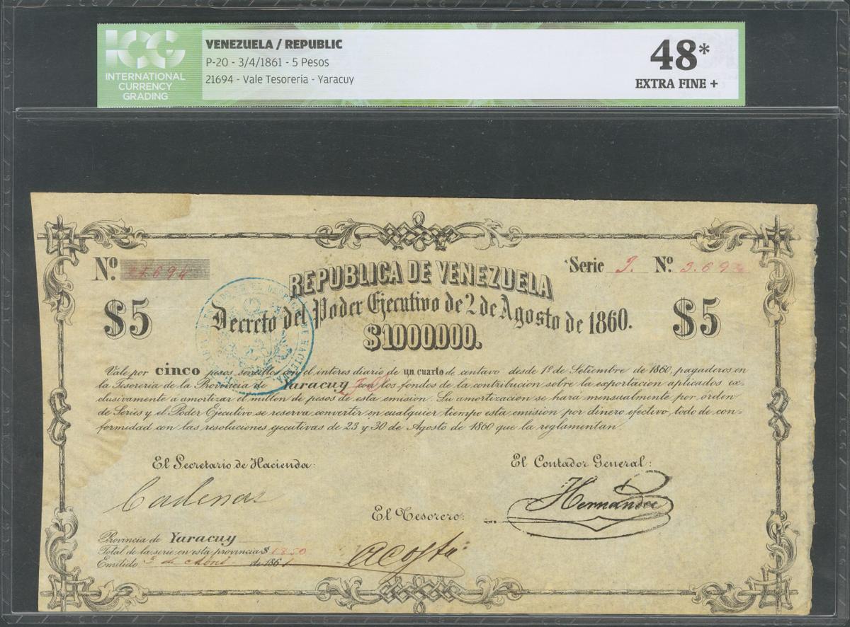 VENEZUELA. 5 Pesos. 3 April 1861. (Pick: 20). Very Rare. ICG48* (Humidity at left) (to get an idea of the rarity of this banknote, the last one sold was for 800 dollars (PMG 35NET) at the Stack's Bowers. Galleries auction house).