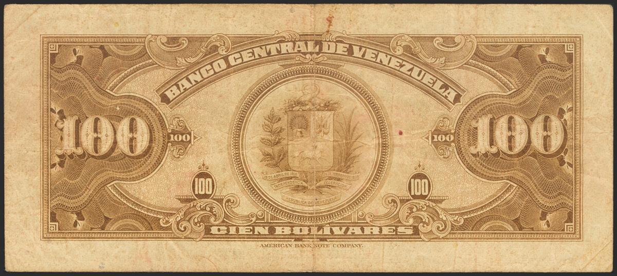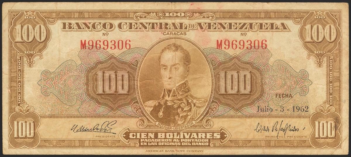VENEZUELA. 100 Bolívares. 3 de Julio de 1962. Signatures: Alfredo Machado and Carlos Rafael Silva. Serie M and 6 digits (Pick: 34d, Sleiman: 73). VF.