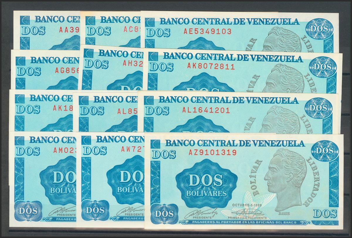 VENEZUELA. Set of 15 banknotes of 2 Bolívares, 5 de Octubre de 1989, series AA, AC, AE, AG, AH, AK(2), AL(2), AM, AW, AZ, BL, BP and XX. (Pick: 69, Sleiman: 1, 3, 5, 7, 8, 10(2), 11(2), 12, 15, 17, 20, 22 y 27). About Uncirculated/Uncirculated.