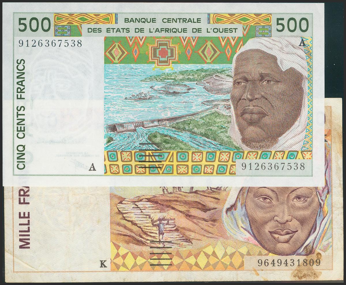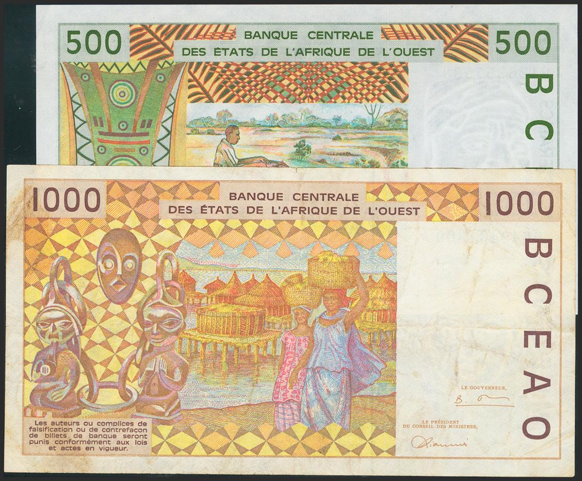 WEST AFRICAN STATES. Set of 2 banknotes: 500 Francs, 1000 Francs. 1991-1996. (Pick: 110Aa, 111Af). Very Fine to About Uncirculated.