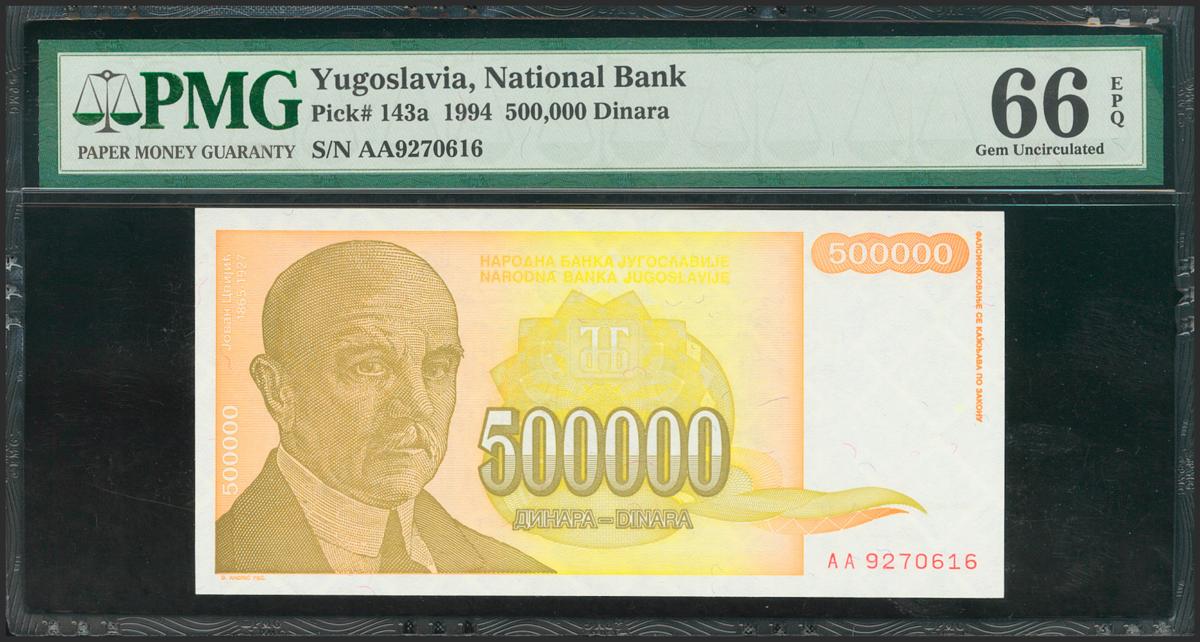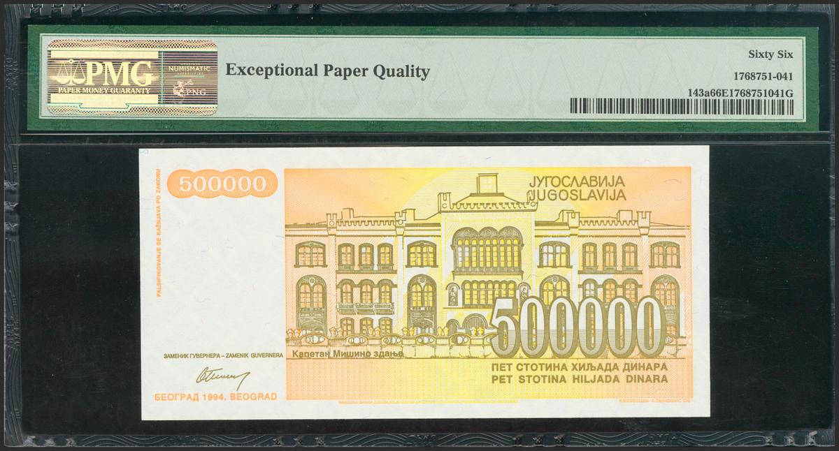 YUGOSLAVIA. 500000 Dinares. 1994. (Pick: 143a). PMG66EPQ.