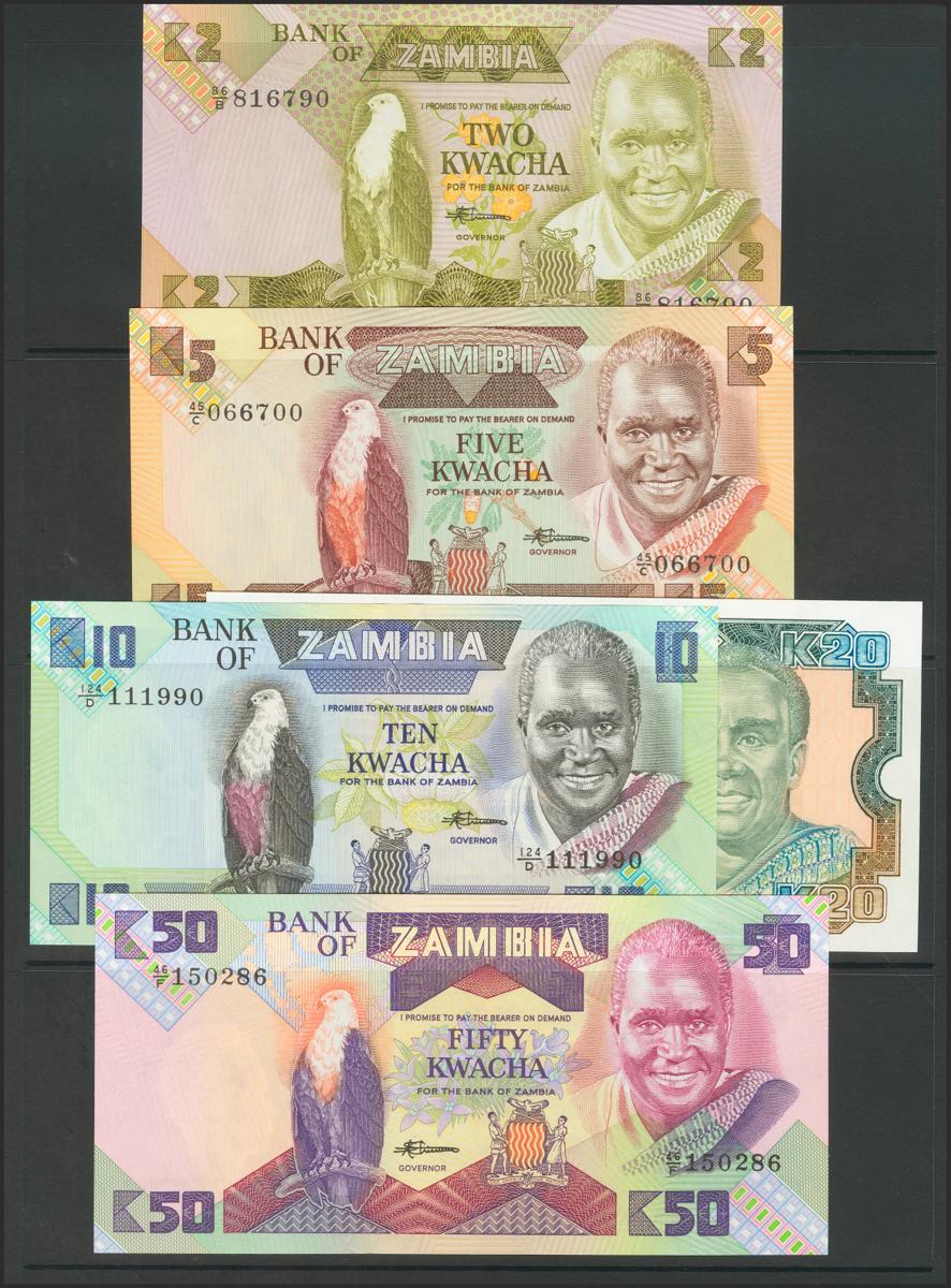 ZAMBIA. Set of 5 banknotes: 2 Kwacha, 5 Kwacha, 10 Kwacha, 20 Kwacha, 50 Kwacha. (1986ca). (Pick: 24c, 25d, 26e, 28a, 32b). Uncirculated.