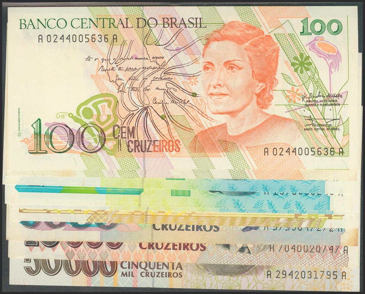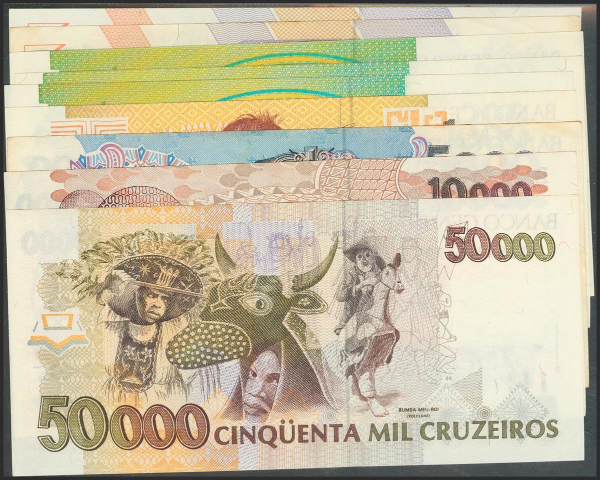 BRAZIL. Set of 9 banknotes: 100 Cruzeiros (2), 200 Cruzeiros (3), 1000 Cruzeiros, 5000 Cruzeiros, 10000 Cruzeiros and 50000 Cruzeiros. 1990-1993. (Pick: 228, 299, 231b, 232c, 233c, 234a). Very Fine to Uncirculated.