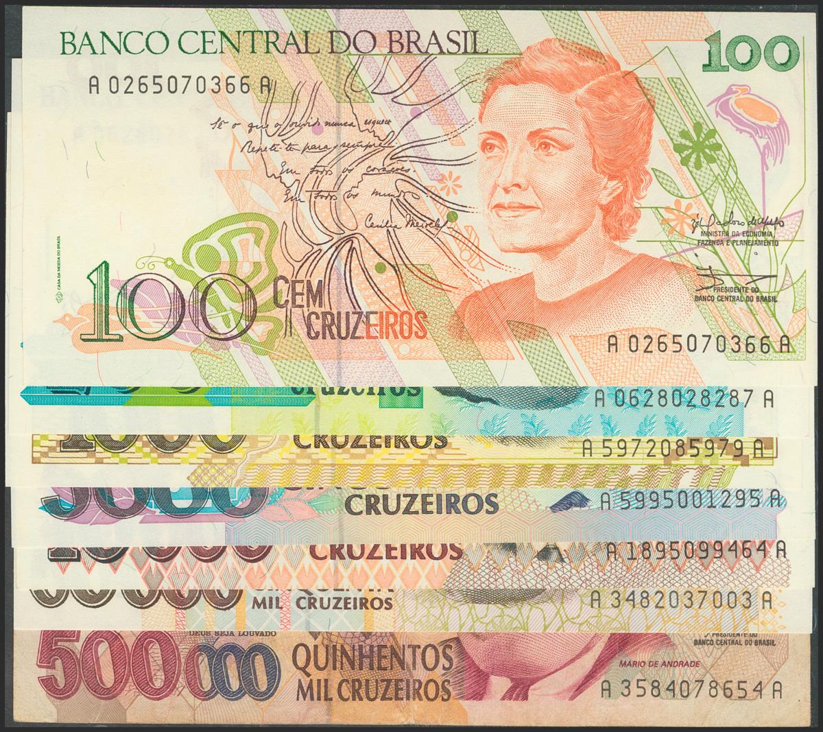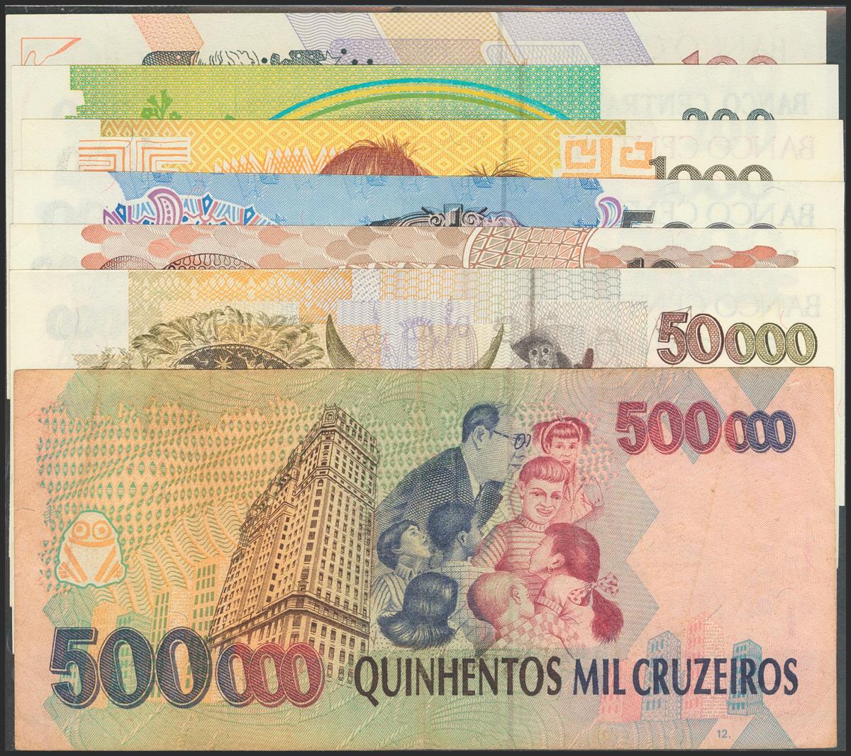 BRAZIL. Set of 7 banknotes: 100 Cruzeiros, 200 Cruzeiros, 1000 Cruzeiros, 5000 Cruzeiros, 10000 Cruzeiros, 50000 Cruzeiros and 500000 Cruzeiros. 1990-1993. (Pick: 228, 229, 231b, 232c, 233a, 234a, 236b). Uncirculated, except for 236b, which is Very Fine.