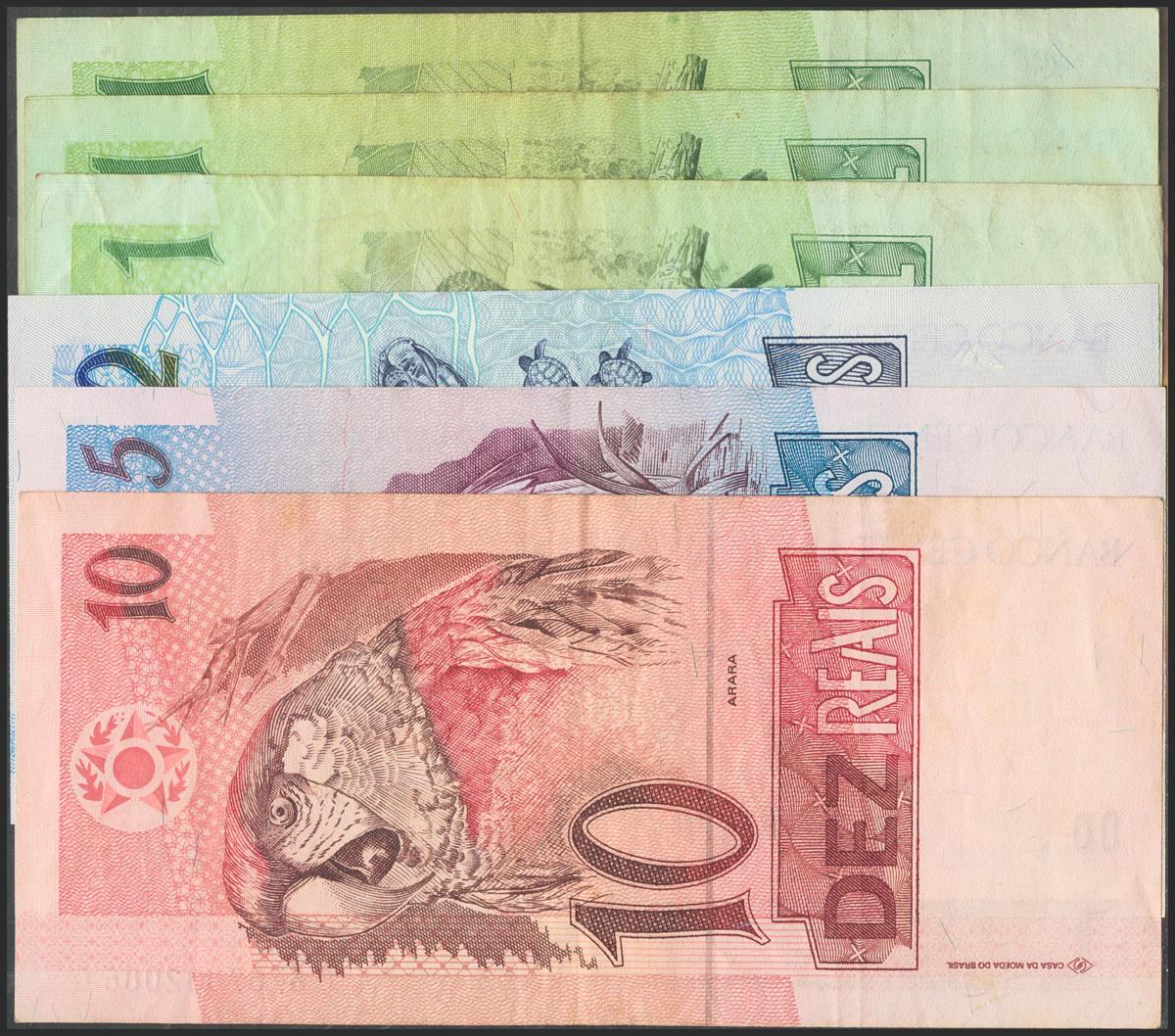 BRAZIL. Set of 6 banknotes: 1 Real (3), 2 Reais, 5 Reais and 10 Reais. 1994-2008. (Pick: 243Ac, 243Ad, 249e, 244Ai,245Ag). Very Fine to Uncirculated.