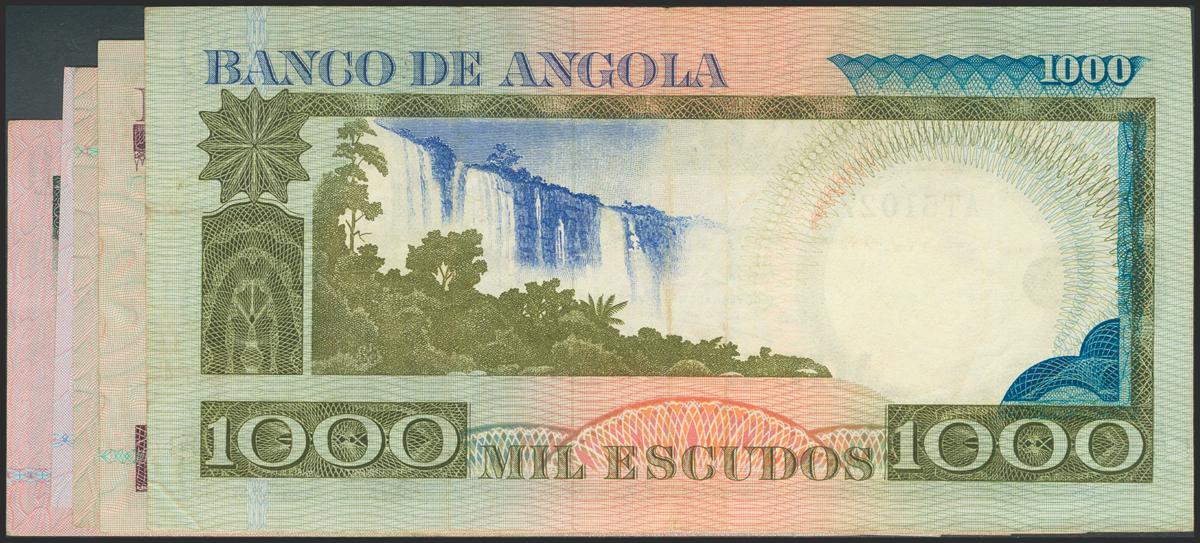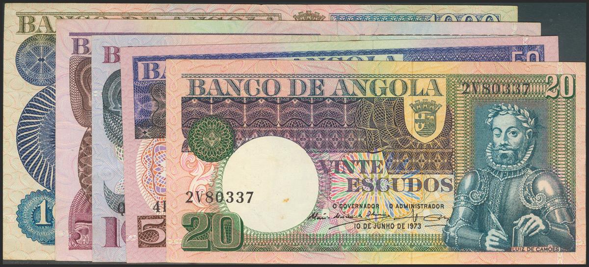 ANGOLA. Set of 5 banknotes, complete series (20 Escudos, 50 Escudos, 100 Escudos, 500 Escudos and 1000 Escudos). 1973. Banco de Angola. (Pick: 104, 105, 106, 107, 108). Very Fine to About Uncirculated.
