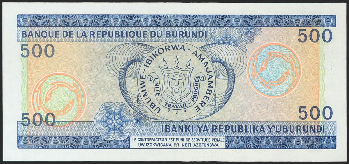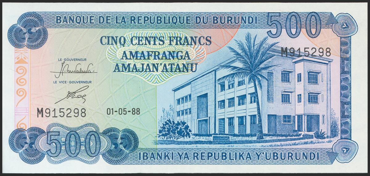 BURUNDI. 500 Francs. 1988. (Pick: 30c). Uncirculated.