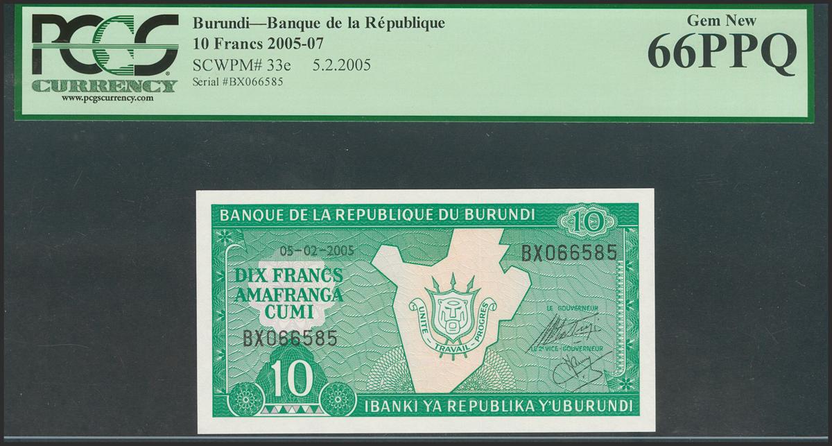 BURUNDI. 10 Francs. 5 February 2005. (Pick: 33e). PCGS66PPQ.