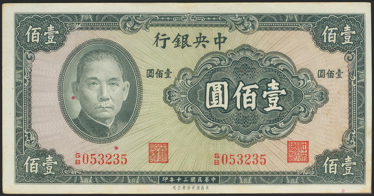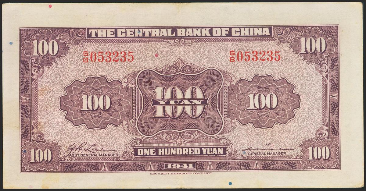 CHINA (REPUBLIC). 100 Yuan. 1941. Central Bank of China. (Pick: 243a). A bit dirty on margins. Extremely Fine.
