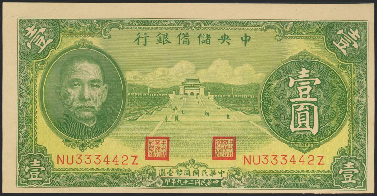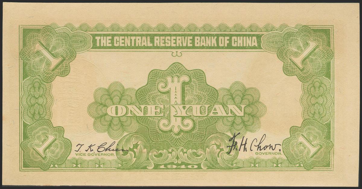 CHINA (REPUBLIC). 1 Yuan. 1940. Central Reserve Bank of China. Out of register printing on obverse. (Pick: J8a). Excellent paper quality. About Uncirculated.