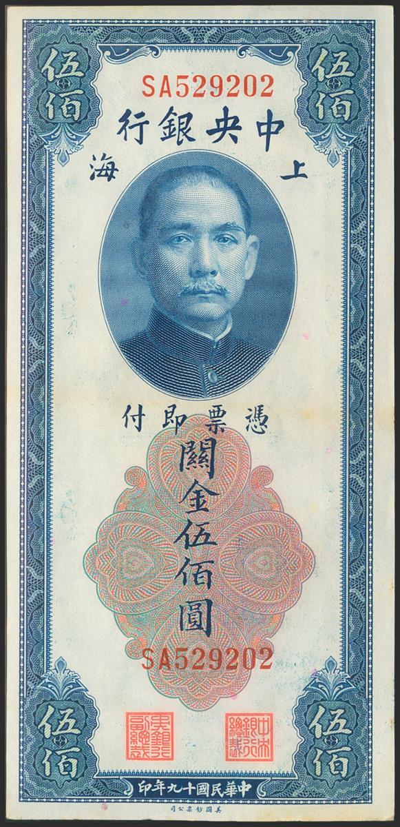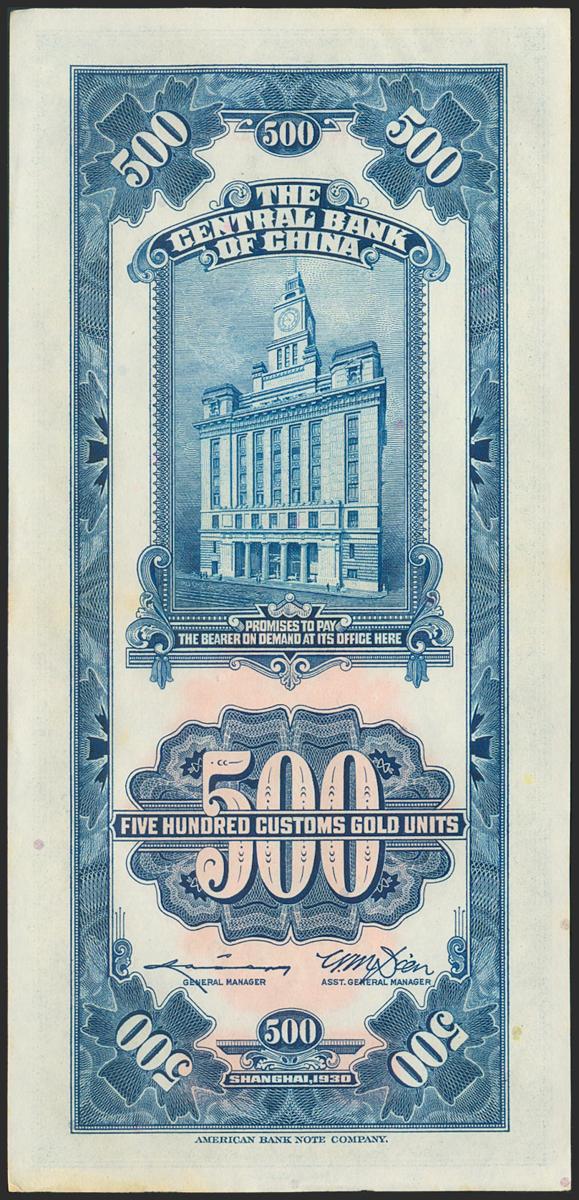 CHINA (REPUBLIC). 500 Customs Gold Units. 1930. Central Bank of China. Blue. Printer: ABNC. (Pick: 332). About Uncirculated.